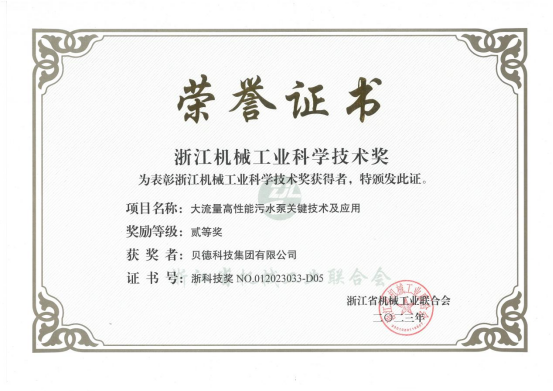 2023年12月,浙江省機(jī)械工業(yè)聯(lián)合會(huì)發(fā)布了《關(guān)于表彰2023年度浙江機(jī)械工業(yè)科學(xué)技術(shù)獎(jiǎng)獎(jiǎng)勵(lì)項(xiàng)目的決定》,表彰在機(jī)械工業(yè)科技工作中作出突出貢獻(xiàn)的單位和人員,共112個(gè)項(xiàng)目獲獎(jiǎng),其中一等獎(jiǎng)14項(xiàng)、二等獎(jiǎng)28項(xiàng)、三等獎(jiǎng)70項(xiàng),貝德科技集團(tuán)有限公司憑借“大流量高性能污水泵關(guān)鍵技術(shù)及應(yīng)用”項(xiàng)目榮獲二等獎(jiǎng)!